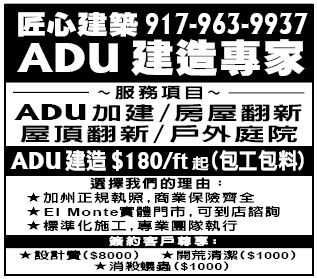 匠心建築917-963-9937 | ADU建造專家 ADU加建/房屋翻新 屋頂翻新/戶外庭院 服務項目 ADU加建/房屋翻新 屋頂翻新/戶外庭院 ADU建造180/ft起(包工包料) 選擇我們的理由:加州正規執照,商業保險齊全EI Monte實體門市,可到店諮詢標準化施工,專業團隊執行簽約客戶尊享:設計費(8000) 開荒清潔(1000)消殺蟻蟲(1000)