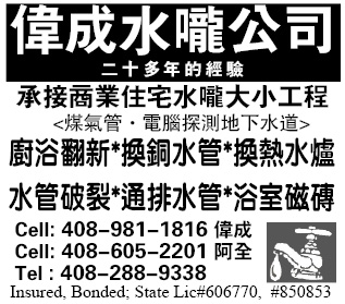偉成水嚨公司 | 承接商業住宅水嚨大小工程(煤氣管,電腦探測地下水道)廚浴翻新,換銅水管,換熱水爐,水管破裂,通排水管,浴室瓷磚408-981-1816 偉成408-605-2201 阿全408-288-9338Insured,Bonded; Lic#606770, 850853
