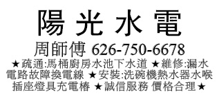 陽 光 水 電 | 周師傅 626-750-6678 疏通:馬桶廚房水池下水道 維修:漏水電路故障換電線 安裝:洗碗機熱水器水喉插座燈具充電樁 誠信服務 價格合理