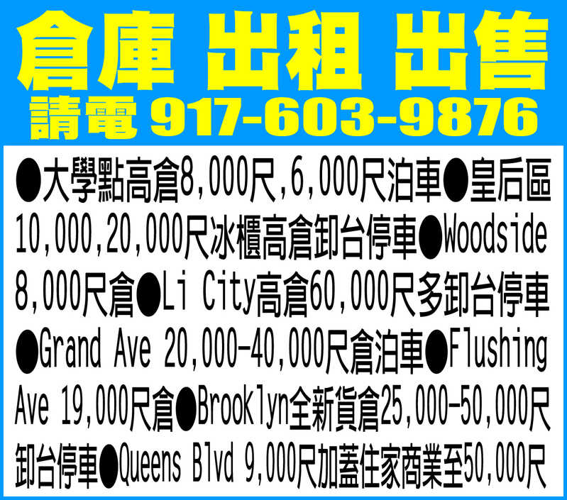 倉庫 出租 出售 917-603-9876 | 長島貨倉 10000-50000呎 卸貨櫃 停車。 大學點高倉 8,000尺, 6,000尺泊車。 BQE/Lie 10,000-50,000尺冰櫃高倉卸台停車。 Morgan Ave 25,000尺, 32000尺高倉卸台。 Woodside 8,000尺倉。 Li City 高倉 60,000尺多卸台停車。 Grand Ave 20,000-40,000尺倉泊車。 Flushing Ave 19,000尺倉。 Brooklyn新貨倉 25,000-50,000尺卸台停車。