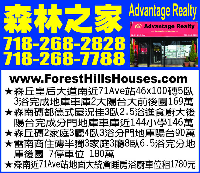 森林之家 | 718-268-2828, 718-268-7788, http://www.ForestHillsHouses.com 森丘皇后大道南近71Ave站46x100磚5臥3浴完成地庫車庫2大陽台大前後園169萬 森南磚都德式屋況佳3臥2.5浴進食廚大後陽台完成分門地庫車庫近144小學146萬 森丘磚2家庭3廳4臥3浴分門地庫陽台90萬 雷南商住磚半獨3家庭3廳8臥6.5浴完分地庫後園 7停車位180萬 森南近71Ave站地面大統倉睡房浴廚車位租1780元