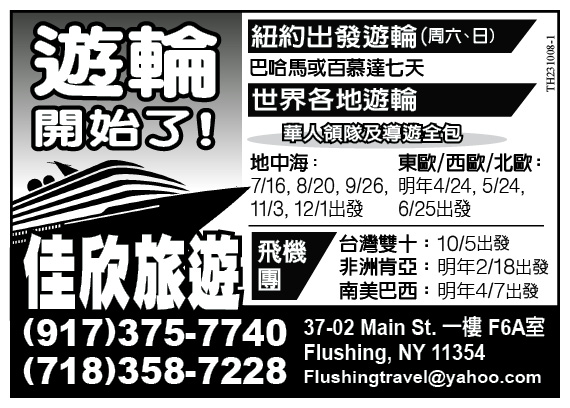 紐約出發遊輪周六、日啟航,提供巴哈馬或百慕達七天遊及全球多地遊輪行程。 華人領隊導遊全包服務。 地中海遊輪,東歐/西歐/北歐遊輪。 飛機行程包括、非洲肯亞、南美巴西、南極冰川、澳洲和杜拜。 詳洽佳欣旅遊(917)375-7740,地址:Flushing, 37-02 Main St. 一樓F6A室,電郵Flushingtravel@yahoo.com。